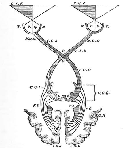 Keywords: Principles of Psychology (James) v1 p49.png en The human brain mechanism of vision <P>Fig 15 ”Scheme of the mechanism of vision after Seguin The cuneus convolution Cu of the right occipital lobe is supposed to be injured and all the parts which lead to it are darkly shaded to show that they fail to exert their function F O are the intra-hemispheric optical fibres P O C is the region of the lower optic centres corpora geniculata and quadrigemina T O D is the right optic tract; C the chiasma; F L D are the fibres going to the lateral or temporal half T of the right retina; and F C S are those going to the central or nasal half of the left retina O D is the right and O S the left eyeball The rightward half of each is therefore blind in other words the right nasal field R N F and the left temporal field L T F have become invisible to the subject with the lesion at Cu </P> <P>From the first edition of The Principles of Psychology by William James 1890 vol I page 49 <P> 1890 https //archive org/details/principlesofpsyc001jame Internet Archive scan of the book William James other versions PD-old-100-1923 Principles of Psychology 1890 Illustrations of the human brain Visual impairment |