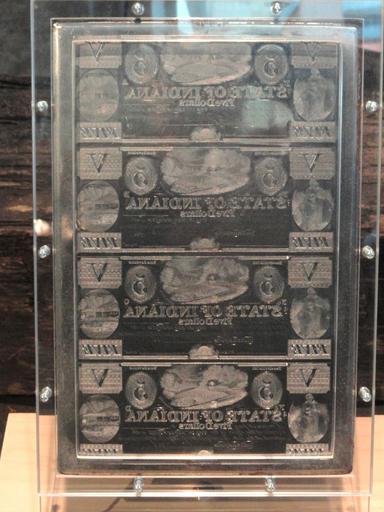 Keywords: Printing plate - Indiana State Museum - DSC00419.JPG Printing plate for 5 banknotes from the State of Indiana circa 1840 Indiana State Museum 650 West Washington Street Indianapolis Indiana USA I took this photograph 2011-03-31 16 50 30 Daderot Public domain Indiana State Museum Printing plates Money of Indiana |