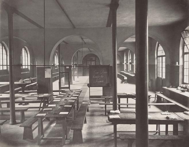| Keywords: Prison de la Santé - Réfectoire et Salle d'École.jpg Photograph Creator Hippolyte-Auguste Collard en City Police Préfecture Paris en Prison de la Santé Réfectoire et Salle d'École - Large room with rows of wooden tables and bench seats papers and books on tables abacus and blackboard behind tables depicted people depicted place between 1876 1880 albumen silver 66 5 x 57 cm accession number H87 208/21 SLVIC-digitalimage 273521 H87 208/21 Album with leather covered cardboard covers 148 cardboard leaves holding 69 albumen silver print photographs on one side of leaf only Individual titles and official photographer stamped below image Title embossed on front cover with seal of the City of Paris in gilt ink ; title also on spine Label inside front cover reads Presented to the Public Library c Victoria on the eighth day of April 1881 by the Government of France Hand inscribed note on first page of album upper left Presented April 8th 1881 illegible Photographs various sizes 38 x 27 cm and smaller <br> Album was designed to show the use of photography in the solving of crimes and disasters Gift of the French Government possibly following the International Exhibition of 1880 <br> Official photographer's stamp on each page lower left some images dated 1876 and 1880 One photographer identified Hippolyte-Auguste Collard Institution State Library of Victoria object history exhibition history credit line Gift; Government of France; 1881 Information field Author Préfecture de police de Paris Service Photographique PD-100 Prison de la Santé Ville de Paris Préfecture de police Images of Paris from the State Library of Victoria Refectories |