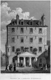 | Keywords: Prison de l'Abbaye St. Germain, 1831 B.jpg Although the Prison de l'Abbaye Saint-Germain dates as far back as 1522 it is best known for the massacre that took place at its gates in September of 1792; a total of 314 people were killed here at this time during the Reign of Terror After the Revolution the building was used solely as a military prison as shown here and its main cell was located 30 feet below ground and did not allow ample room for a prisoner to stand upright The prison was eventually destroyed in 1857 when the boulevard Saint-Germain was extended 1831 engraving Institution Brown University Library object history exhibition history credit line accession number 1093026042776375 PD-old Engravings of buildings in Paris Images of Paris from the Brown University Library 1831 in Paris 1831 engravings Prison de l'Abbaye |