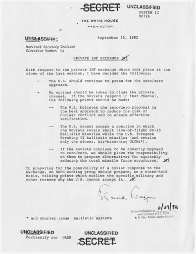 | Keywords: Private INF Exchange - NARA - 198210.jpg Scope and content General notes 198210 Local identifier President 1981-1989 Reagan National Security Council 1981 - 1989 Ronald Reagan Library NLRR 40 Presidential Drive Simi Valley CA 93065-0600 1982-09-15 Record group Collection RR-NSC Numbered National Security Policy Papers 1981 - 1989 Record group ARC 1189 National Security Decision Directives compiled 02/25/1981 - 01/19/1989 Series ARC 198166 File unit File unit ARC Variant control numbers NAIL Control Number NLS-NSC-NSDD-56 Other versions <gallery> File Private_INF_Exchange_-_NARA_-_198210 tif tif File Private_INF_Exchange_-_NARA_-_198210 jpg jpg </gallery> NARA-cooperation PD-USGov Presidential Decision Directives Reagan |