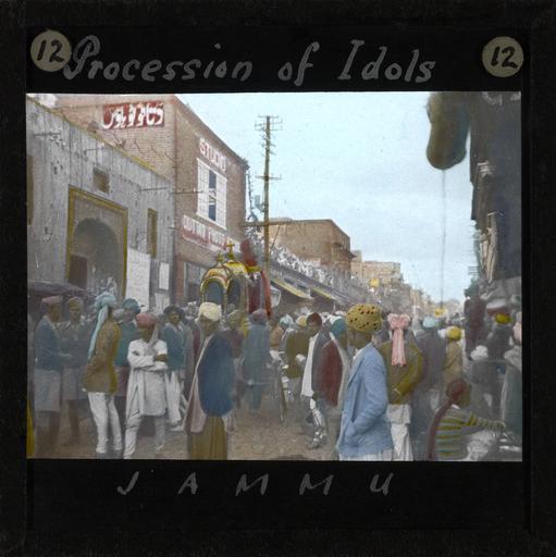 | Keywords: Procession of Idols, Jammu, India, ca.1875-ca.1940 (imp-cswc-GB-237-CSWC47-LS10-012).jpg en <br> Procession of Idols Jammu India ca 1875-ca 1940 Photograph of a procession of idols through the streets of Jammu city A large group of people are gathered and an idol can be seen elevated from the crowd to the left of the picture The procession is on a street with brick buildings to either side ; This belongs to a series of Church of Scotland Foreign Missions Committee lantern slides relating to Jammu City which is also known as the City of Temples A mission station occupied by Church of Scotland missionaries was founded here in the late 19th/early 20th century Jammu is also one of the three administrative divisions within Jammu and Kashmir the northernmost state in India Photographer Unknown Filename imp-cswc-GB-237-CSWC47-LS10-012 tif Coverage date 1875/1940 Part of collection International Mission Photography Archive ca 1860-ca 1960 Geographic subject region Jammu and Kashmir Type images Part of subcollection Photographs from the Centre for the Study of World Christianity University of Edinburgh U K ca 1900-ca 1940s Repository name Centre for the Study of World Christianity Archival file impaunpub_Volume7/1728 url Repository address The University of Edinburgh School of Divinity New College Mound Place Edinburgh EH1 2LX United Kingdom Geographic subject country India Format aacr2 1 lantern slide 8 x 8 cm Geographic subject continent Asia Rights Contact the repository for details Part of series In the Temple City of Jammu LS10 Repository email divinity-CSWC ed ac uk Subject lcsh Keyword Worship; Religious gatherings Date created 1875/1940 Publisher of the digital version University of Southern California Libraries Subject aat genre exterior views Format aat lantern slides Legacy record ID impa-m69236 Access conditions http //www ed ac uk/schools-departments/divinity/research/centres/world-christianity/collections-resources File GB 237 CSWC47/LS10/12 1875/1940 author http //digitallibrary usc edu/cdm/ref/collection/p15799coll123/id/64846 PD-old-70-1923 Magic lantern images Images from USC Digital Library uploaded by Fæ International Mission Photography Archive ca 1860-ca 1960 Jammu Processions in India |