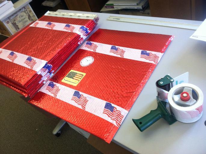 | Keywords: indoor Outer envelope for the proclamation is a 19x22" bright red bubblepak with American Flag packing tape as an accent. Outer envelope for the proclamation is a 19x22" bright red bubblepak with American Flag packing tape as an accent. |