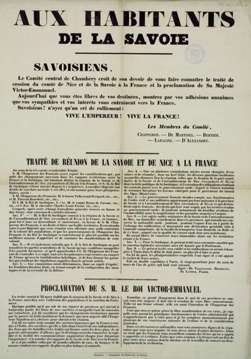 | Keywords: Proclamation-VictorEmmanuel1860.jpg fr Aux habitants de la Savoie Traité de réunion de la Savoie et de Nice à la France Proclamation de S M le roi Victor-Emmanuel 24 mars 1860 «Cette affiche provient des archives départementales de la Savoie et du site Internet de Conseil général de la Savoie http //www savoie fr/archives73/expo_affiches_1814-1860/ Aux habitants de la Savoie annexion; Savoie; Chambéry Imprimeur de Puthod fils au Verney 1860 1860 PD-old PD-old Poster of Savoie | ||||