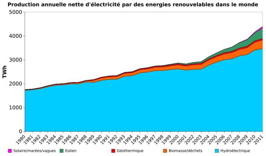 Keywords: Production électricité énergies renouvelables dans le monde.svg fr production annuelle nette d'électricité par des énergies renouvelables dans le monde 1980-2011 Created with Gnumeric http //www eia gov/countries/data cfm EIA Lery007 2012-04-22 Cc-zero thumb English version Renewable energy statistics |