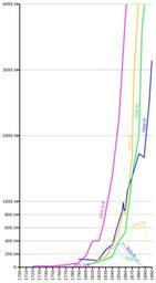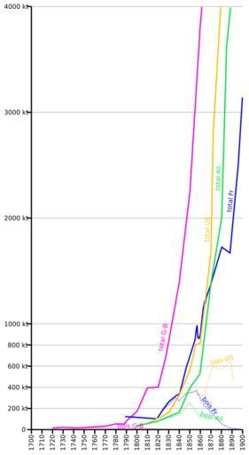 Keywords: Production fonte au bois France Allemagne G-B US mid range.svg fr Évolution de la production de fonte au haut fourneau durant les XVIII et XIX siècles fonte totale coke + charbon de bois et fonte au charbon de bois Dans le cas des US la fonte totale intègre aussi celle à l'anthracite en Blast furnace pig iron production evolution during the XVIII and XIX centuries total iron produced with coke + charcoal and iron produced with charcoal only For the US iron production total iron includes the anthracite iron production own Borvan53 2011-12-19 Production fonte au bois France Allemagne G-B US svg Production fonte au bois France Allemagne G-B svg <gallery> File Production fonte au bois France Allemagne G-B US svg Smaller Y axis File Production fonte au bois France Allemagne G-B svg Smaller Y axis Without US data </gallery> Created with Inkscape wikitable center + Évolution de la production de fonte aux XVIII et XIX siècles fonte totale coke + anthracite + charbon de bois et fonte au charbon de bois background adcdf1 scope col scope col Total G-B scope col Bois G-B scope col Total Fr scope col Bois Fr scope col Total US scope col Bois US scope col Total All scope col Bois All - 1740 16200 14045 4 - 1788 62700 13900 - 1789 130000 127400 - 1800 190000 19000 40000 40000 40000 - 1810 54000 54000 - 1819 112500 110500 - 1820 400000 0 110000 90000 89640 - 1825 198200 194200 - 1827 690500 - 1830 266600 239300 165000 165000 - 1837 331700 297200 - 1840 1390000 0 340700 270700 347000 347000 170000 144840 - 1842 399500 297200 - 1847 591000 339000 - 1850 2250000 0 560000 402000 259692 - 1855 849296 360818 - 1856 923147 374983 813000 365850 - 1857 992332 374279 - 1858 871556 326314 - 1859 864899 333457 - 1860 3830000 0 898353 316500 820000 530000 128260 - 1861 966896 276018 - 1862 1090838 273893 - 1863 1156875 256115 - 1864 1217000 189000 1204000 305000 - 1865 1204000 194000 - 1866 1253100 213000 - 1870 1390000 1670000 1390000 0 - 1872 2800000 600000 - 1876 5960000 0 - 1880 1725000 55000 2000000 - 1881 4144254 570391 - 1885 3687000 - 1889 7871778 644300 - 1888 1683300 12800 - 1890 12000 - 1891 4641217 - 1892 9157000 457850 - 1895 5788798 - 1896 2525100 7500 - 1913 5207000 1000 Cc-zero Steel production SVG temporal graphs Diagrams of iron and steel industry |