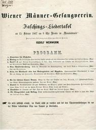 | Keywords: Programm Faschings-Liedertafel-1867-Donauwalzer.jpg en Original Program of the Premiere from An der schönen blauen Donau de Original-Programm der Premiere von žAn der schönen blauen Donau Wienbibliothek http //www wienbibliothek at/bestaende-und-sammlungen/druckschriftensammlung/neuerwerbungen/oktober10 html Neuerwerbungen Oktober 2010 - Donauwalzer im Dianabad The Kallir Family Collection Author 1867 Information field Transcription <center>Wiener Männer-Gesangverein<br/>Faschings-Liedertafel<br/>am 15 Februar 1867 um 8 Uhr Abends im žDianabadsaale <br/>unter der Leitung des Chormeisters Herrn<br/>RUDOLF WEINWURM<br/>- - - -<br/>PROGRAMM</center><br/>1 Ouverture für Orchester <br/>2 Prolog von Mendelssohn-Bartholdy singbar gemacht und mit erläuterndem Text versehen von Julius Hopp Neu <br/>3 Antik O ne Moderne Konzertaufführung für Chor Solo Deklamation und Orchester von Sophoklesheim Worte von Grandjean Musik von Konradin Neu <br/>4 Eine Wahlbesprechung Polka für Männerchor mit Klavierbegleitung von Josef Koch v Langentreu Neu Text von Grandjean <br/>5 Heinz der Bluthund oder das Rosengärtlein auf Aggstein Hyperromantisches Ritterschauspiel in einem Akte mit Gesang von Hannold Grandjean und Kneißler Musik von Konradin Neu <br/><center>- - - -</center><br/>6 An der schönen blauen Donau Walzer für Chor und Orchester von Joh Strauß k k Hofballmusik-Direktor dem Wiener Männergesangvereine gewidmet Text von Weyl Neu <br/>7 Sextett für Streichinstrumente und zwei Waldhörner von Mozart gespielt von Herrn Konzertmeister Hellmesberger seinem Sohne Josef und den Herren Kreipl Röver Rich Lewy und Pichler <br/>8 Quodlibet für Tenorsolo und Chor Text von Weyl Musik von Julius Hopp Neu <br/>9 Die Sängerfahrt nach Peking Große lyrisch-komische Operette mit Ballet in einem Akte Musik von Julius Otto Neu <br/><center>- - - -</center><br/>Es wird höflichst ersucht im Saale nicht zu rauchen und bei den Theatervorstellungen die vor der Bühne befindlichen Sitze den Damen zu überlassen An der schönen blauen Donau PD-old |