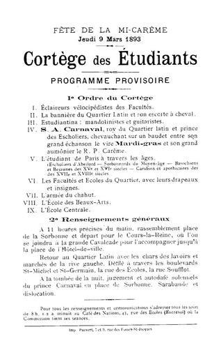 Keywords: Programme provisoire Mi-Carême des étudiants 1893.jpg fr Le programme des étudiants parisiens pour la cavalcade de la Mi-Carême 1893 Feuille imprimée anonymous 1893-03 Domaine public PD-old Carnaval de Paris Mi-Carême au Carnaval de Paris 1893 Mi-Carême au Carnaval de Paris 1893 |