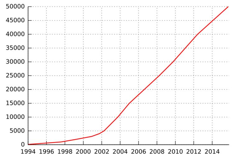 Keywords: Project Gutenberg total books.svg en Graph showing total number of books published by Project Gutenberg over time Own work by uploader based on 'Book Milestones' statistics from http //www gutenbergnews org/statistics/ Qef 2008-07-02 other versions Alternative graph bitmap version of this but based on slightly different data Image PG_growth png other fields Gnuplot + Source code and data This graph was generated with gnuplot using the following input file <source lang gnuplot> set terminal svg font Bitstream Vera Sans 12 size 600 400 set output Project_Gutenberg_total_books svg set xdata time set timefmt Y- m set xrange 1994-01 2015-11 set format x Y set key off unset mxtics set xtics nomirror set ytics nomirror set grid set border 3 plot Project_Gutenberg_total_books data using 1 2 \ with line linetype rgbcolor red linewidth 2 </source> The data file 'Project_Gutenberg_total_books data' is derived from the 'Book Milestones' section of the http //www gutenbergnews org/statistics/ Project Gutenberg news site statistics page plus the http //www gutenbergnews org/20151003/project-gutenberg-releases-ebook-50000/ news page for the release of ebook 50000 and currently contains the following <pre> 1971-07 1 1989-08 10 1994-01 100 1997-08 1000 1999-05 2000 2000-12 3000 2001-10 4000 2002-04 5000 2003-10 10000 2005-01 15000 2008-04 25000 2009-10 30000 2012-06 40000 2015-10 50000 </pre> Qef Project Gutenberg Images with Gnuplot source code