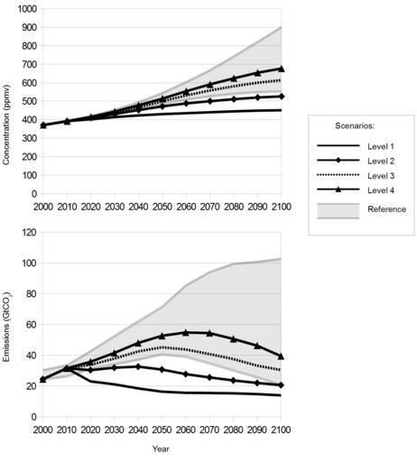 | Keywords: Projected carbon dioxide emissions and atmospheric concentrations over the 21st century for reference and mitigation scenarios.png carbon dioxide CO<sub>2</sub> emissions and atmospheric concentrations for reference and climate change mitigation scenarios In the reference scenarios light grey it is assumed that no efforts are made to reduce anthropogenic i e human-produced greenhouse gas emissions In the mitigation scenarios anthropogenic CO<sub>2</sub> emissions are reduced sufficiently to stabilize atmospheric CO<sub>2</sub> concentrations at approximately 450 to 750 parts-per-million by volume ppmv <ref> Table TS 2 in Technical Summary in harvnb Clarke others 2007 9 </ref> Non-CO<sub>2</sub> anthropogenic greenhouse gas emissions are also reduced in the stabilization scenarios but this is not shown in the graph In the mitigation scenarios CO<sub>2</sub> emissions peak then decline The lower the atmospheric stabilization level of CO<sub>2</sub> the sooner the peak occurs In the 450 ppm scenario emissions peak in 2010 In the 550 ppm scenario emissions level off between 2010 and 2050 then decline In the 650 ppm scenario emissions peak in 2050 while in the 750 ppm scenario they peak in 2060-70 Emissions in the reference scenarios vary widely In the highest emissions reference scenario emissions increase steadily over most of the 21st century In the lowest emissions reference scenario emissions peak in 2050 then decline In all of the mitigation scenarios atmospheric CO<sub>2</sub> concentrations in 2000 are 371 ppm Concentrations increase gradually over the century In 2100 concentrations in the mitigation scenarios are 451 526 614 and 677 ppm In the reference scenarios concentrations in 2000 range between 369 and 372 ppm In 2100 concentrations range from 553 to 901 ppmv Emissions Most of the scenario data is listed in a later section as comma-separated values The following text briefly summarizes changes in CO<sub>2</sub> emissions for the scenarios The first number is the year labelled y This is followed by the projected range of emissions across the reference scenarios r then the projected range of emissions across the mitigation scenarios The following labels are used for the mitigation scenarios L1 450 ppm L2 550 ppm L3 650 ppm L4 750 ppm Emissions are measured in billion tonnes of CO<sub>2</sub> GtCO<sub>2</sub> 2000 y 24-30 r 24 L1 to L4 2030 y 34-52 r 21 L1 32 L2 38 L3 42 L4 2060 y 39-85 r 16 L1 28 L2 44 L3 55 L4 2090 y 26-101 r 15 L1 22 L2 33 L3 46 L4 2100 y 21-103 r 14 L1 21 L2 30 L3 39 L4 Concentrations The following text summarizes changes in atmospheric CO<sub>2</sub> concentrations for the scenarios The same labels are used as for emissions Concentrations are measured in parts-per-million by volume ppmv 2000 y 369-372 r 371 L1 to L4 2030 y 434-453 r 414 L1 431 L2 439 L3 444 L4 2060 y 509-603 r 435 L1 488 L2 531 L3 554 L4 2090 y 549-821 r 449 L1 520 L2 600 L3 654 L4 2100 y 553-901 r 451 L1 526 L2 614 L3 677 L4 Data sources Scenario data are taken from Clarke et al 2007 <ref name clarke data > https //web archive org/web/20130616054921/http //www climatescience gov/Library/sap/sap2-1/finalreport/CCSP-2-1A-Scenario-Information-070707 xls CCSP-2-1A-Scenario-Information-070707 xls in Clarke others 2007 </ref> and the International Institute for Applied System Analysis IIASA 2009 <ref name iiasa data > IIASA 2009 </ref> Data from Clarke et al 2007 <ref name clarke data /> are in the public-domain and are included in a following section Data from IIASA 2009 <ref name iiasa data /> can be freely downloaded from their website The graph is based on six reference scenarios and four mitigation scenarios Three of the reference scenarios are taken from Clarke et al 2007 and are labelled IGSM_REF MERGE_REF and MINICAM_REF The other three reference scenarios are taken from IIASA 2009 and are labelled A2r - Baseline B1 - Baseline and B2 “ Baseline All three of the mitigation scenarios are taken from Clarke et al 2007 and are labelled IGSM_Level1 IGSM_Level2 IGSM_Level3 and IGSM_Level4 Notes reflist References citation CITEREFClarkeothers2007 Clarke L et al July 2007 Scenarios of Greenhouse Gas Emissions and Atmospheric Concentrations Sub-report 2 1A of Synthesis and Assessment Product 2 1 by the U S Climate Change Science Program and the Subcommittee on Global Change Research Department of Energy Office of Biological Environmental Research Washington DC USA http //library globalchange gov/products/assessments/2004-2009-synthesis-and-assessment-products/sap-2-1a-scenarios-of-greenhouse-gas-emissions-and-atmospheric-concentrations citation CITEREFIIASA2009 IIASA 2009 International Institute for Applied System Analysis IIASA GGI Scenario Database Ver 2 0 http //www iiasa ac at/Research/GGI/DB/ own Enescot 2013-07-19 Data As stated only public-domain data from Clarke et al 2007 are included Data from IIASA 2009 can be freely accessed from their website Data were exported from OpenOffice org 3 4 1 Calc as comma separated values csv The following options were used Character set Western Europe 1252 Field delimiter Text delimiter Quote all text cells no Save cell content as shown yes Fixed column width no <pre> Region Category Sub Category Variable Units Run Label 2000 2010 2020 2030 2040 2050 2060 2070 2080 2090 2100 World Climate Info Anthropogenic Emissions Fossil and Other Industrial CO2 gigatonnes of C IGSM_REF 6 6842737198 8 612683805 10 7913220822 12 9109122699 15 5859919198 18 0949347622 20 1681232183 21 6016525719 22 7027775309 23 5308099523 24 1038326684 World Climate Info Anthropogenic Emissions Fossil and Other Industrial CO2 gigatonnes of C IGSM_Level1 6 6842737207 8 612683805 6 298030909 5 7749571923 5 0600890858 4 4762424559 4 2689948554 4 2433450752 4 1848760513 4 0449946885 3 8263214058 World Climate Info Anthropogenic Emissions Fossil and Other Industrial CO2 gigatonnes of C IGSM_Level2 6 6842737207 8 612683805 8 2957637412 8 7209027128 8 914172585 8 3905127406 7 582856