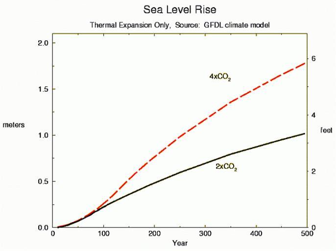 Keywords: Projected change in global sea level rise if atmospheric carbon dioxide concentrations were to either quadruple or double (NOAA GFDL).png sea level rise if atmospheric carbon dioxide CO<sub>2</sub> concentrations were to either quadruple or double Edited quote from the cited public-domain source In response to greenhouse gas warming sea level is expected to rise due to the thermal expansion of sea water as the ocean warms Because the deep ocean will warm much more slowly than the upper ocean the thermally driven rise in sea level is expected to continue for centuries after atmospheric CO<sub>2</sub> stops increasing The graph shows the increase of global mean sea level in the GFDL 4xCO<sub>2</sub> coupled climate model experiment Even though CO<sub>2</sub> no longer increases after year 140 sea level continues to rise steadily well beyond year 500 The final equilibrium sea level change in the model is 1 9 meters for a CO<sub>2</sub> doubling not shown which is roughly the level attained in the CO<sub>2</sub> quadrupling experiment after 500 years The equilibrium rise for the quadrupling experiment has not yet been simulated These sea level rise projections are the expected changes due to thermal expansion of sea water alone and do not include the effect of melted continental ice sheets With the effect of ice sheets included the total rise could be larger by a substantial factor However projections of the contribution of the ice sheets to future sea level rise are not presented here due to the difficulties of performing a credible calculation For reference the volume of ice in the Greenland and Antarctica ice sheets is equivalent to a sea level rise of 7 and 73 meters respectively IPCC 1995 see current sea level rise for more information Details on the simulation The results presented are based on several multi-century integrations of a GFDL global coupled ocean-atmosphere model The model resolution is about 4 degrees latitude In the quadrupled 4xCO<sub>2</sub> experiment CO<sub>2</sub> increases at 1 per year compounded to a level four times that of the present climate After this 140 year ramp-up period the model is integrated for several more centuries to examine the long time response of the climate system including the deep ocean For comparison results are also presented from the 2xCO<sub>2</sub> experiment in which CO<sub>2</sub> increases by a factor or two in the first 70 years and then is constant at 2xCO<sub>2</sub> for several more centuries of model integration citation http //www gfdl noaa gov/climate-impact-of-quadrupling-co2 Geophysical Fluid Dynamics Laboratory - Climate Impact of Quadrupling CO<sub>2</sub> NOAA GFDL Princeton NJ USA NOAA GFDL 2012-11-28 Retouched picture 1 Changed color of graph's background from yellow to white 2 changed solid red line plotted on graph to a dashed red line ensures the graph can be used by color-blind users and printed using a grey-scale printer Sea level statistics Global warming graphs Enescot |