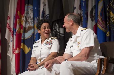 Keywords: Promotion ceremony 140701-N-WL435-185.jpg en Chief of Naval Operations CNO Adm Jonathan Greenert and Vice Adm Michelle Howard share a laugh on stage during her promotion ceremony at the Women in Military Service for America Memorial Secretary of the Navy SECNAV Ray Mabus promoted Howard to the rank of admiral in the presence of family and friends Howard is the first woman to be promoted to the rank of admiral in the history of the Navy and will assume the duties and responsibilities as the 38th Vice Chief of Naval Operations from Adm Mark Ferguson U S Navy photo by Chief Mass Communication Specialist Peter D Lawlor/Released 2014-07-01 Petty Officer 1st Class Peter Lawlor https //www dvidshub net/image/1430985 140701-N-WL435-185 2014-07-01 22 52 WASHINGTON DC US PD-USGov-Military-Navy Mark E Ferguson III Ray Mabus Jonathan W Greenert in 2014 Images from DoD uploaded by Fæ |