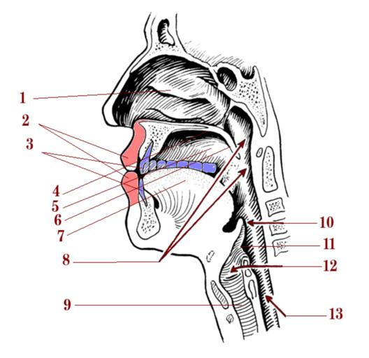 | Keywords: Pronunciation organs diagram.png eu Aho eta eztarri inguruak ikasteko irudia Ahoa eta eztarria 1 Sudurreko barrunbea; 2 Ezpainak; 3 Hortzak; 4 Ahosabaia; 5 Ahoko barrunbea; 6 Ahosabai biguna; 7 Mihia mingaina; 8 Faringea giranoia; 9 Laringea; 10 Epiglotisa; 11 Laringerako sarbidea; 12 Ahots kordak; 13 Hestegorria esofagoa Marrazki hau beste honen gainean egina http //commons wikimedia org/wiki/File Pharynx_ 28PSF 29 png en Head neck Mouth larynx tongue teeth epiglottis pharynx 1 Nose; 2 Lips; 3 Teeth; 4 Palate; 5 Hard palate; 6 Soft palate; 7 Tongue; 8 Pharynx; 9 Larynx; 10 Epiglottis; 11 12 Vocal folds; 13 Esophagus Diagram via http //commons wikimedia org/wiki/File Pharynx_ 28PSF 29 png 2016-09-02 own Obsuser File Ahoa eta eztarria zenbakiekin png cc-zero Mouths Human anatomy diagrams labelled with numbers only Tongue Upper respiratory tract Human pharynx Phonetics |