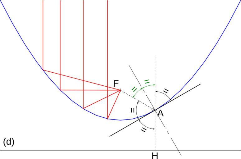 Keywords: Propriete reflexion parabole-tangente bissectrice.svg en The reflection property of a parabolic mirror is explained by a geometrical property of the parabolas the tangent at a point A is the bisecting line of the angle FAH fr La propriété de réflexion d'un miroir parabolique est expliquée par une propriété géométrique de sparaboles la tangente en un point A est la bissectrice de l'angle FAH own 2014-03-12 Christophe Dang Ngoc Chan Cdang <span class signature-talk >talk</span> inkscape cdang Parabolas Concave mirror diagrams Cc-zero |