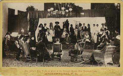 Keywords: Prospect House in Blue Mountain Lake, New Yorkjpg.jpg The image shows men and women posed on a makeshift stage in the parlour of the Prospect House in Blue Mountain Lake New York A number of well-dressed men and women sit in chairs facing the stage The hotel's chandelier hangs in front of the valance curtain Prospect House was situated at the foot of Blue Mountain on a point of land jutting out into Blue Mountain Lake The six-story 300-room Prospect House opened in 1882 It had many modern conveniences that other hotels in the area did not have such as a steam-powered elevator http //postalpicture blogspot com br/2012/01/on-with-show html ~ 1882 Creator Albert Bierstadt PD-old-100 Albert Bierstadt