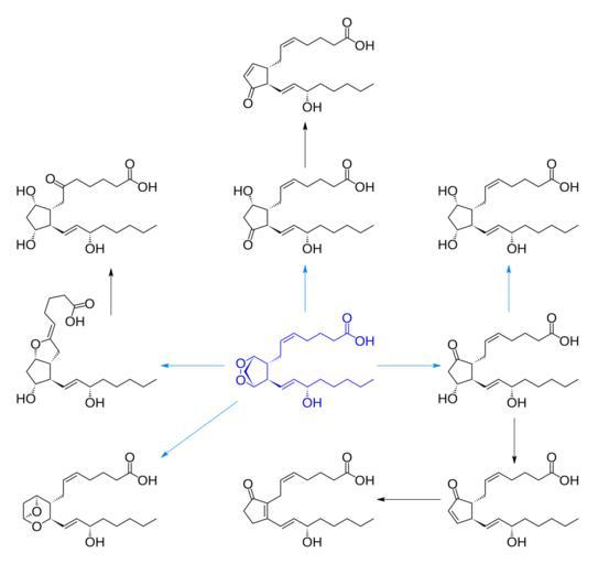 Keywords: Prostanoid synthesis unlabeled.svg Schematic diagram of w prostanoid synthesis from prostaglandin H<sub>2</sub> Created with http //www acdlabs com/download/chemsk html ACD/ChemSketch 10 0 and Inkscape Created with Inkscape ;Legend blue Parent compound w prostaglandin H<sub>2</sub> red Daughter compounds lightblue w Enzyme -mediated reaction Enzyme<br>Prostanoid compound ;Compounds depicted Prostaglandin H<sub>2</sub> Prostaglandin E<sub>2</sub> Prostaglandin F<sub>2</sub> Prostaglandin A<sub>2</sub> Prostaglandin B<sub>2</sub> Prostaglandin D<sub>2</sub> Prostaglandin J<sub>2</sub> Prostaglandin I<sub>2</sub> prostacyclin 6-keto-prostaglandin Fα Thromboxane A<sub>2</sub> ;Enzymes depicted A Prostaglandin E synthase B Prostaglandin E 9-ketoreductase C Prostaglandin D synthase D Prostacyclin synthase E Thromboxane-A synthase Own work based on information from http //www lipidlibrary co uk/Lipids/eicprost/index htm the Lipid Library and Image Eicosanoid synthesis png by JFW <br>Made by author upon request by David Throop on the Image Request page of the English Wikipedia's Chemistry Project 2007-11-03 Fvasconcellos thumb left English versionthumb center Numbered version Biosyntheses Eicosanoids |