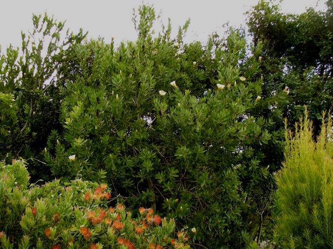 Keywords: Protea mundii with leucospermum gueinzii in foreground.jpg Protea mundii bush Kirstenbosch Gardens 2007-01 Andrew Massyn Protea mundii