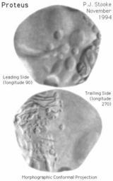 | Keywords: Proteus map (Stooke).jpg Original caption SHADED RELIEF MAP OF PROTEUShttp //publish uwo ca/~pjstooke/proteus txt Proteus gif is a shaded relief map of Proteus a small inner satellite of Neptune As with all maps it is the cartographer's interpretation and not all features are necessarily certain given the limited data available - this interpretation stretches the data as far as is feasible The original map was published in its full form with latitude-longitude grid and feature names in Stooke P J 1994 The Surfaces of Larissa and Proteus EARTH MOON AND PLANETS V 65 pp 31-54 Positions in the map are controlled by a digital shape model described in that paper For this map the three dimensional convex hull of the shape model was projected into the Morphographic Conformal Projection the conventional Stereographic Projection modified for non-spherical worlds The leading side longitude 90 runs vertically down the centre faces forwards in the orbit of Proteus The trailing side longitude 270 runs vertically down its centre faces backwards along the orbit Longitude 0 is at the righthand end of the leading side and faces Neptune As with all conformal true shape projections the scale in these maps varies increasing from the centre to the outer edge The map projection is described in Stooke P J and Keller C P 1990 Map Projections for Non-Spherical Worlds / the Variable-Radius Map Projections CARTOGRAPHICA V 27 No 2 pp 82-100 This version of the file with labels intact is in the public domain Philip Stooke Department of Geography University of Western Ontario London Ontario Canada N6A 5C2 stooke sscl uwo ca Stooke P J 1994 The Surfaces of Larissa and Proteus EARTH MOON AND PLANETS V 65 pp 31-54 1994 Stooke P J Stooke P J Original upload log en wikipedia Proteus_map_ 28Stooke 29 jpg 2006-01-05 22 48 Kwamikagami 400×640× 47753 bytes <nowiki>;Original caption SHADED RELIEF MAP OF PROTEUShttp //publish uwo ca/~pjstooke/proteus txt Proteus gif is a shaded relief map of Proteus a small inner satellite of Neptune As with all maps it is the cartographer's interpretation and not all feature</nowiki> Proteus moon |