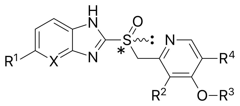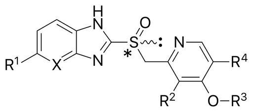 Keywords: Proton pump inhibitors structure.svg proton pump inhibitor s Asterisk indicates stereocenter Dots indicate lone pair own Anypodetos 2012-02-07 pd-chem wikitable style margin 1em auto 1em auto; - rowspan 2 Compound colspan 5 Substituents rowspan 2 Form rowspan 2 Cysteine binding colspan 2 pK<sub>a</sub> First approval - X R<sup>1</sup> R<sup>2</sup> R<sup>3</sup> R<sup>4</sup> pKa<sub>a1</sub> pKa<sub>a1</sub> year - Omeprazole CH OCH<sub>3</sub> CH<sub>3</sub> CH<sub>3</sub> CH<sub>3</sub> Racemic mixture 813 and 892 4 06 0 79 1989 in USA - Esomeprazole CH OCH<sub>3</sub> CH<sub>3</sub> CH<sub>3</sub> CH<sub>3</sub> S - ˆ’ -enantiomer of lansoprazole 813 and 892 4 06 0 79 2001 in USA - Lansoprazole CH H CH<sub>3</sub> CH<sub>2</sub>CF<sub>3</sub> H Racemic mixture 813 and 321 3 83 0 62 1991 in Europe - Dexlansoprazole CH H CH<sub>3</sub> CH<sub>2</sub>CF<sub>3</sub> H R - + -enantiomer of lansoprazole 813 and 321 3 83 0 62 2009 in USA - Pantoprazole CH OCHF<sub>2</sub> OCH<sub>3</sub> CH<sub>3</sub> H Racemic mixture 813 and 822 3 83 0 11 1994 in Germany - Rabeprazole CH H CH<sub>3</sub> CH<sub>2</sub> <sub>3</sub>OCH<sub>3</sub> H Racemic mixture 813 892 and 321 4 53 0 62 1999 in USA - Tenatoprazole N OCH<sub>3</sub> CH<sub>3</sub> CH<sub>3</sub> CH<sub>3</sub> Racemic mixture 813 and 822 4 04 “0 12 ” valid svg Cc-zero Proton pump inhibitors
