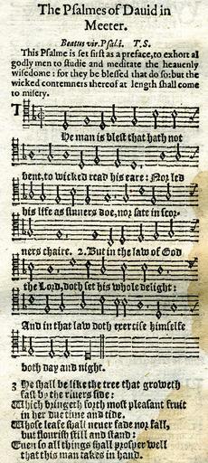 | Keywords: Psalm 1 metrical 1628.jpg Psalm 1 in 1628 printing with tune metrical version by Thomas Sternhold 1628 Book in uploader's ownership 1628 Thomas Sternhold and John Hopkins Scan 2007 by Steven J Plunkett out of copyright Transcript The Psalmes of David in Meeter <br><br> Beatus vir Psal i Blessed is the man Psalm 1 T S Thomas Sternhold <br><br> This Psalme is set first as a preface to exhort al <br> godly men to studie and meditate the heavenly <br> wisedome for they be blessed that do so but the <br> wicked contemners thereof at length shall come <br> to misery <br> <br> The man is blest that hath not bent to wicked men read his eare Nor led his life as sinners doe nor sate in scorners chaire <br> 2 But in the law of God the Lord doth set his whole delight And in that law doth exercise himselfe both day and night <br> 3 He shall be like the tree that groweth fast by the rivers side Which bringeth forth most pleasant fruit in her due time and tide Whose leafe shall never fade nor fall but flourish still and stand Even so all things shall prosper well that this man takes in hand PD-old-100 Psalm 1 Hymns |