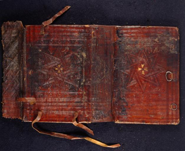Keywords: Psalter-Coptic (Sahidic) - Upper cover (Or50000).jpg Star Religious miscellaneous Coptic; Caption Upper cover; Colour Brown; Edge Unspecified exhibition history Decorative Technique Tooled in blind Tooled in gold; Cover Material Goatskin includes morocco turkey etc Coptic Doublue boards made from papyrus D Cockerell 1932 p 10 Szirmai the sheets of papyrus for the boards were made up to twice the size of the book folded like a quire and sewn through the fold hence the attachment forms an integral part of the sewing with two single leather thongs at the top and bottom and three on the front edge of the upper cover and three simple metal rings anchored with short leather straps in the corresponding places on the front edge of the lower cover For other covers of Coptic codices at the British Library see Or 5001 Or 6801 Or 7027 and Or 7597 For high resolution image please go to Images Online There is a demonstration of Coptic sewing on ibookbinding com object history Text 7 - 8c; Egypt; Unspecified object type Cc-zero place of creation Binding Egypt place of discovery Szirmai J A The archaeology of medieval bookbinding Aldershot Brookfield VT Ashgate Publishing 1999 Lindsay Jen The Edfu Collection of Coptic Books New Bookbinder v 21 2001 Pages 31-51; Sharpe John The Earliest Bindings with Wooden Board Covers The Coptic Contribution to Binding Construction International Conference on Conservation and Restoration of Archive and Library Materials - Preprints Erice 22-29 April 1996 pp 381-400 Bookbinding 2000 proceedings a collection of papers from the June 2000 conference celebrating the installation and opening of the Bernard C Middleton collection Rochester N Y 2002 British Library image http //www bl uk/catalogues/bookbindings/LargeImage aspx RecordId 020-000018036 ImageId ImageId 56865 Copyright BL Psalter Coptic Sahidic Uploaded with GWToolset Psalter Coptic Sahidic - Upper cover Or50000 http //www webarchive org uk/bldatasets/bindings/Or5000 jpg 8th-century bookbinding British Library Oriental Manuscripts British Library Bookbindings |