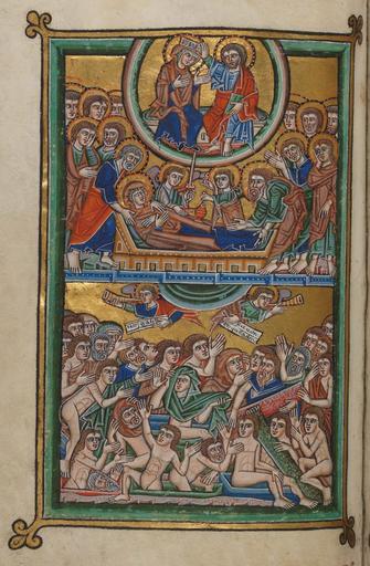 | Keywords: Psalterium Feriatum Cod Don 309 088.jpg Bild aus Psalterium Feriatum Hildesheim bald nach 1235 Württembergische Landesbibliothek Stuttgart Cod Don 309 http //digital wlb-stuttgart de/purl/bsz35289279X after 1235 anonymous PD-old-100 Psalterium Feriatum Cod Don 309 Dormition of Virgin Mary in miniatures Medieval miniatures of Coronation of Mary Resurrection of the dead | ||||