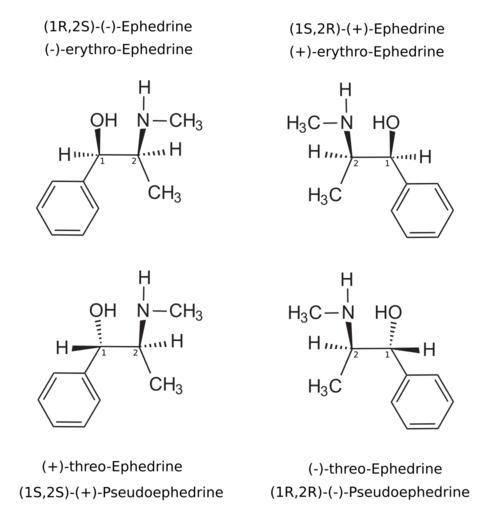 | Keywords: (pseudo)ephedrine enantiomers.svg en The two pairs of enantiomers of ephedrine Top ephedrine<br> Bottom pseudoephedrine<br> IUPAC Name 2- methylamino -1-phenylpropan-1-ol The stereocenters are numbered own Wickey-nl 2009-12-15 Ephedrine Pseudoephedrine Inkscape validSVG |