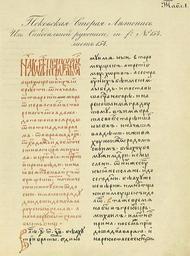 | Keywords: Pskovskaya letopis 1.jpg ru 2-я Псковская летопись Факсимильная копия пе вого листа Синодального списка дати уемого концом 15 века Вступление псковского летописца и ф агмент ачальной Летописи - лето 6362 от сотво ения ми а основание Киева A 19th century facsimile copy of the first verses of the 2nd Pskov Chronicle the w en Primary Chronicle chronist's introduction in red and the legendary foundation of Kiev by Kiy Schek and Khoriv in the year 6362 from Creation 854 AD in blue ПСРЛ Т 5 w en Complete Collection of Russian Chronicles 1841-1863 edition vol 5 The text more or less common to all East Slavic chronicles is attributed to semi-legendary w en Nestor the Chronicler; surviving copies separated from their source by many centuries were edited glossed or amended by countless anonymous scribes This page is a facsimile edition of the so-called Synode Copy of the 2nd Pskov Chronicle Modern cursive text belongs to the 19th century publishers contains bibliographical references Source chronicle handwritten in late 15th century script; not later than 1510 - Псковские летописи Т 2 1953 с 4 Printed facsimile edition which is reproduced here was published in series in 1841-1862 PD-old Pskov Chronicle Founders of Kiev |