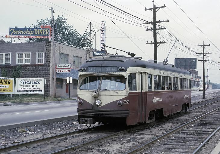 publictransit masstransit PSTC 22 (PCC) on Ardmore Rail Division along West Chester Pike, near Llanerch Shops in Upper Darby, August 1964.jpg PSTC Red Arrow PCC 22 on the Ardmore route runs in the West Chester Pike median in Upper Darby in August 1964 bound for 69th Street Terminal https //www flickr com/photos/129679309 N05/22500114950/ PSTC 22 PCC on Ardmore Rail Division along West Chester Pike near LLanerch Shops in Upper Darby PA Roll sign 69th ST TERMINAL on August 28 1964 1964-08-28 Roger Puta RogerPuta Pennsylvania Route 3 PCC streetcars of the Philadelphia Suburban Transportation Company 1964 in tram transport in the United States 1964 in Pennsylvania Upper Darby Township Delaware County Pennsylvania Flickr images uploaded by User Pi 1415926535 1964 in rail transport in the United States |