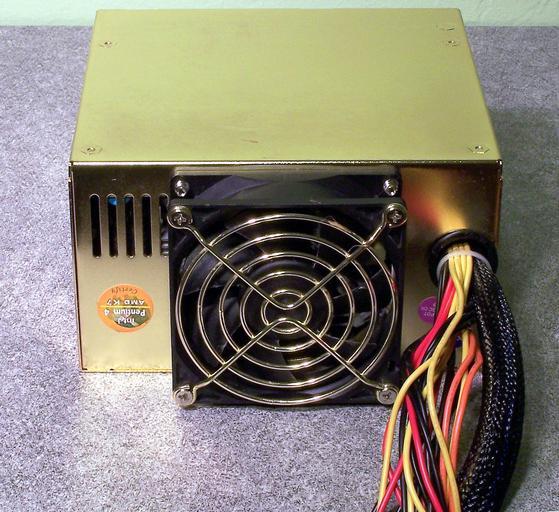 Keywords: PSU-gold-rear.jpg This is the rear facing inside of a Power Supply Unit or PSU for an ATA computer Note the 80mm fan and place where all the wires exit Own photograph <br> Camera Kodak DX7590 5MP 10X <br> Lighting 3 fluorescent lamps 3 incandescent bulbs no flash 2005-03-22 mboverload mboverload Computer power supply units |