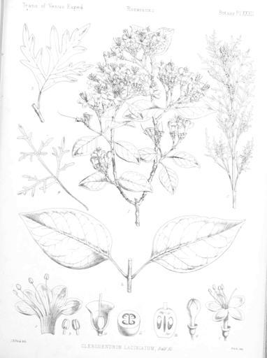 | Keywords: PTRS168 0669.png Clerodendron laciniatum <small>Balf fil </small> Clerodendrum laciniatum <small>Balf f </small> twig of adult tree with flowers leaves of adult tree leaf of young tree leaf of very young tree twig of very young tree flower bud fully opened flower corolla and androecium from inside anthers gynoecium in calyx transverse section of unripe fruit vertical section of unripe fruit Philosophical Transactions of the Royal Society 168 An Account of the Petrological Botanical and Zoological Collections Made in Kerguelen's Land and Rodriguez During the Transit of Venus Expedition Carried Out by Order of Her Majesty's Government in the Years 1871-1875 Plate XXXII 1879 Scan by the Internet Archive Author died more than 70 years ago - public domain PD-old Philosophical Transactions - Volume 168 Clerodendrum laciniatum Verbenaceae botanical illustrations Unripe fruits |