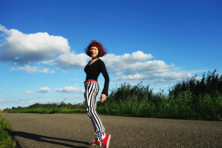 Keywords: woman model fashion pose fashion woman fashionwoman fashion model fashionmodel style stripes striped pants stripedpants cool hip person people road sky clouds public domain dedication publicdomaindedication pixabay pexels mabelamber