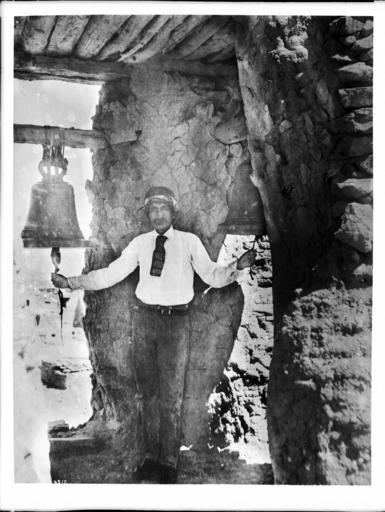 | Keywords: Pueblo Indian bell-ringer in the belfry of the old church, Acoma Pueblo, ca.1900 (CHS-4517).jpg en <br> Pueblo Indian bell-ringer in the belfry of the old church Acoma Pueblo ca 1900 Photograph of a pueblo Indian bell-ringer in the belfry of the old church Acoma Pueblo ca 1900 The belfry is made of adobe with a wood beam roof while two bells hang from wooden beams The bell-ringer can be seen at center wearing long trousers a white long-sleeved shirt and a tie In each hand he can be seen holding the rope hanging from the clapper of each bell Call number CHS-4517 Legacy record ID chs-m16853; USC-1-1-1-13461 Photographer James George Wharton Filename CHS-4517 Coverage date circa 1900 Part of collection California Historical Society Collection 1860-1960 Type images Geographic subject city or populated place Acoma Pueblo Repository name USC Libraries Special Collections Accession number 4517 Microfiche number 1-160-18 Archival file chs_Volume96/CHS-4517 tiff Part of subcollection Title Insurance and Trust and C C Pierce Photography Collection 1860-1960 Repository address Doheny Memorial Library Los Angeles CA 90089-0189 Geographic subject country USA Format aacr2 3 photographs glass photonegative photoprints b w ; 22 x 17 cm 13 x 18 cm 21 x 26 cm Rights Digitally reproduced by the USC Digital Library; From the California Historical Society Collection at the University of Southern California Subject adlf religious facilities; religious facilities Project USC Repository email specol usc edu Identifying number unidentified no James-863 Contributing entity California Historical Society Date created circa 1900 Publisher of the digital version University of Southern California Libraries Format aat photographic prints; photographs Geographic subject state New Mexico Format glass plate negatives Access conditions Send requests to address or e-mail given Phone 213 821-2366; fax 213 740-2343 Subject file heading Indians -- Acoma Subject lcsh Indians of North America; Acoma Indians Subject Acoma Indians; Acoma Indians; Acoma circa 1900 date created James George Wharton http //digitallibrary usc edu/cdm/ref/collection/p15799coll65/id/16775 PD-old-70-1923 Images from USC Digital Library uploaded by Fæ California Historical Society Collection 1860-1960 Glass plate negatives Acoma Pueblo Pueblo people Photographs by George Wharton James |