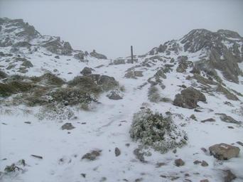 Keywords: Puig de Massanella.jpg en Coll de Ses Cases de Sa Neu Massanella with a wooden GR signpost de GR221-Weg Etappe 7 über den Schneehäuser -Paß der Massanella Own Sarang 2009-02-08 Massanella Signs of GR 221 Landscapes of GR 221 Snow in Mallorca |