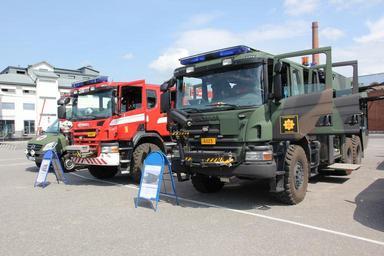 Keywords: Pujo puhdistusajoneuvo ja SM11 sammutusajoneuvo 1.JPG en Pujo puhdistusajoneuvo chemical warfare decontamination vehicle and SM11 fire engine used by Finnish military Pujo is based on Scania Saurus 6x6 fire engine with 279 kW engine and weight of 23930 kg Equipped with Esteri D-240 pump and Rosenbauer R15E water cannon with tank capacity of 4800 liters hydraulic winch Warn 12 capacity 5 4 metric tons and ordinary fire engine equipment Additional equipment include high pressure pumps and cleaners emulsion tank and a decontamination tent with shower Primary function as a decontamination vehicle but can be used as an ordinary fire engine in peace time SM11 is a Scania P380 CB 4x4 Saurus 28 fire engine 279 kW engine weight 17280 kg Esteri D-240 pump Rosenbauer R8E water cannon 1000 l/min/10 bar with 2800 liter tank capacity 15 KVA emergency generator water rescue equipment and Warn 12 hydraulic winch with 5 4 metric ton capacity fi Suomen puolustusvoimien käyttämä Pujo kemiallisen sodankäynnin puhdistusajoneuvo ja SM11 paloauto Pujo on rakennettu Scania Saurus 6x6 paloauton alustalle 279 kW moottorilla ajoneuvon painon ollessa 23930 kg Varustuksena Esteri D-240 pumppu ja Rosenbauer R15E vesitykki joille yhteensä 4800 litran vesisäiliöt Warn 12 5 4 t hydraulivinssi ja normaali sammutusauton pelastuskalusto Puhdistukseen korkeapainepumppu ja -pesurit sekä emulsiosäiliö ja puhdistusteltta lämminvesisuihkulla Päätehtävänä ihmisten ja ajoneuvojen puhdistaminen kemiallisista aineista toimii myös sammutus- ja pelastusajoneuvona SM11 on keskiraskas sammutusauto Scania P380 CB 4x4 Saurus 28 279 kW moottori ajoneuvon paino 17280 kg Varustuksena Esteri D-240 pumppu Rosenbauer R8E vesitykki 1000 l/min/10 bar ja 2800 litran vesisäiliö 15 KVA n varavoimageneraattori pintapelastuskalusto Warn 12 5 4 tonnin hydraulivinssi sekä normaali sammutusauton pelastuskalusto own MKFI 2011-07-09 Finnish Navy anniversary 2011 PUJO decontamination vehicle Military fire engines of Finland Scania fire engines Scania P380 Taken with Canon EOS 60D Taken with Canon EF-S 15-85mm F3 5-5 6 IS USM Files by User MKFI |