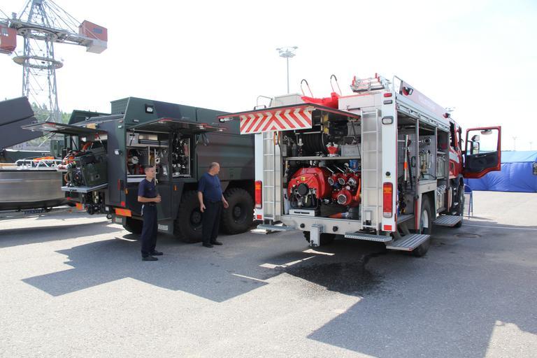 Keywords: Pujo puhdistusajoneuvo ja SM11 sammutusajoneuvo 2.JPG en Pujo puhdistusajoneuvo chemical warfare decontamination vehicle and SM11 fire engine used by Finnish military Pujo is based on Scania Saurus 6x6 fire engine with 279 kW engine and weight of 23930 kg Equipped with Esteri D-240 pump and Rosenbauer R15E water cannon with tank capacity of 4800 liters hydraulic winch Warn 12 capacity 5 4 metric tons and ordinary fire engine equipment Additional equipment include high pressure pumps and cleaners emulsion tank and a decontamination tent with shower Primary function as a decontamination vehicle but can be used as an ordinary fire engine in peace time SM11 is a Scania P380 CB 4x4 Saurus 28 fire engine 279 kW engine weight 17280 kg Esteri D-240 pump Rosenbauer R8E water cannon 1000 l/min/10 bar with 2800 liter tank capacity 15 KVA emergency generator water rescue equipment and Warn 12 hydraulic winch with 5 4 metric ton capacity fi Suomen puolustusvoimien käyttämä Pujo kemiallisen sodankäynnin puhdistusajoneuvo ja SM11 paloauto Pujo on rakennettu Scania Saurus 6x6 paloauton alustalle 279 kW moottorilla ajoneuvon painon ollessa 23930 kg Varustuksena Esteri D-240 pumppu ja Rosenbauer R15E vesitykki joille yhteensä 4800 litran vesisäiliöt Warn 12 5 4 t hydraulivinssi ja normaali sammutusauton pelastuskalusto Puhdistukseen korkeapainepumppu ja -pesurit sekä emulsiosäiliö ja puhdistusteltta lämminvesisuihkulla Päätehtävänä ihmisten ja ajoneuvojen puhdistaminen kemiallisista aineista toimii myös sammutus- ja pelastusajoneuvona SM11 on keskiraskas sammutusauto Scania P380 CB 4x4 Saurus 28 279 kW moottori ajoneuvon paino 17280 kg Varustuksena Esteri D-240 pumppu Rosenbauer R8E vesitykki 1000 l/min/10 bar ja 2800 litran vesisäiliö 15 KVA n varavoimageneraattori pintapelastuskalusto Warn 12 5 4 tonnin hydraulivinssi sekä normaali sammutusauton pelastuskalusto own MKFI 2011-07-09 Finnish Navy anniversary 2011 PUJO decontamination vehicle Military fire engines of Finland Scania fire engines Scania P380 Taken with Canon EOS 60D Taken with Canon EF-S 15-85mm F3 5-5 6 IS USM Files by User MKFI |