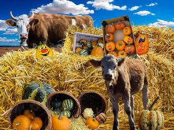 Keywords: pumpkin autumn decorative squashes harvest festival straw straw bales calf cow agriculture harvest basket face orange green deco decoration thanksgiving autumn decoration