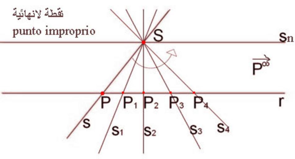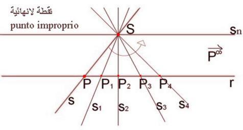 Keywords: Punto-improprio.jpg ar مثلاً لنعتبر خط r و نقطة S خارجه عنة بالنقطة نمرر خط s بحيث يقطع r في نقطة P بدوران الخط حول هذه النقطة S نقطة تقاطع بين الخطين سوف تنتقل تدريجيا إلى مواقع ابعد بالنسبة للنقطة S حتى الحالة التي يكون فيها الخط s مواز للخط ص في هذة الحالة نقطة التقاطع سوف تكون لا نهاية والتي تمثل اتجاه الخط r والخطوط الموازية له 2009-07-28 own Hasanisawi Uploaded with UploadWizard Diagrams in Arabic |