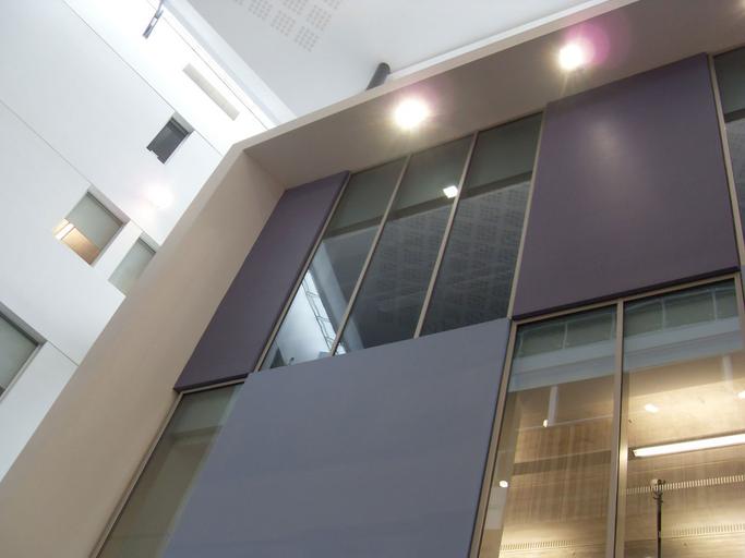 Keywords: purple blue college education panels lights windows glass day daytime ceiling reflections spotlight fluorescent