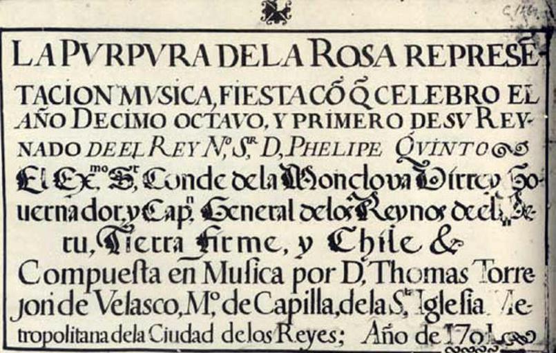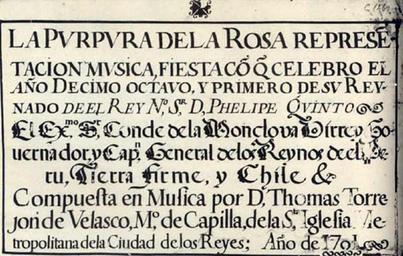 Keywords: Purpura de la rosa score frontispiece.jpg Frontispiece of the original score for La púrpura de la rosa 1701 by Tomás de Torrejón y Velasco 1644-1728 http //www memoriachilena cl/temas/documento_detalle asp id MC0032901 Memoria Chilena Dirección de Bibliotecas Archivos y Museos DIBAM 1701 Tomás de Torrejón y Velasco PD-old-100 Original upload log en wikipedia Purpura_de_la_rosa_score_frontispiece jpg wikitable Frontispiece of the original score for La púrpura de la rosa 1701 by Tomás de Torrejón y Velasco 1644-1728 Source http //www memoriachilena cl/temas/documento_detalle asp id MC0032901 Memoria Chilena Dirección de Biblio Uncategorized 2016 April 1 |