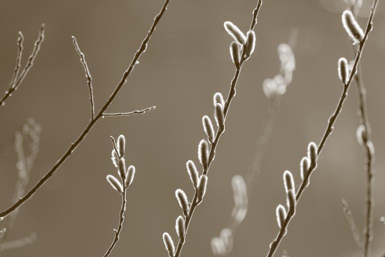 Keywords: pussy willow nature spring awakening bud branch sephia