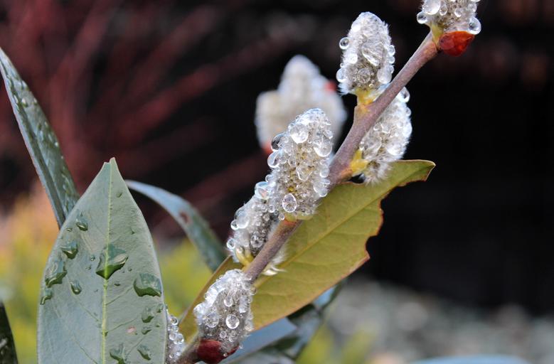 Keywords: pussy willow spring branch harbinger of spring frühlingsanfang leaves ornamental shrub raindrop