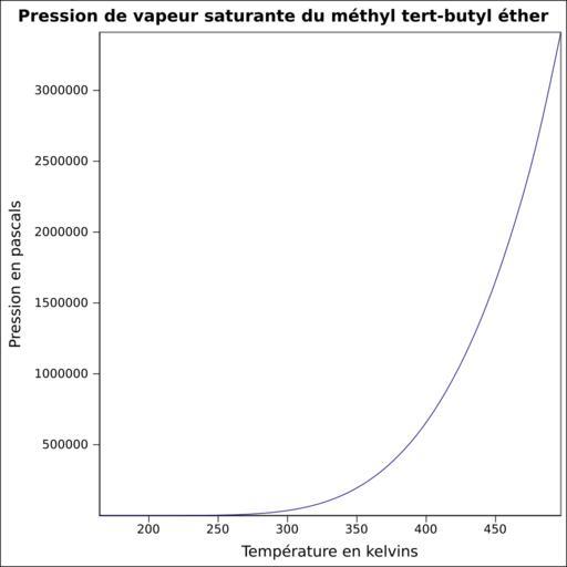 | Keywords: Pvs méthyl tert-butyl éther.svg fr Pression de vapeur saturante calculée d'après <br/> Robert H Perry et Donald W Green Perry's Chemical Engineers' Handbook McGraw-Hill USA 1997 7e éd 2400 p ISBN 0-07-049841-5 p 2-50 own Epop 2010-06-24 Created with Gnumeric Vapor-Liquid equilibrium curves |