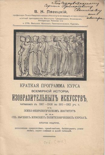 Keywords: Pyasetsky Title Autograph.jpg en The title page of the book К аткая п ог амма ку са всеми ной исто ии изоб азительных искусств by V N Pyasetsky with the dedicatory inscription to Sergei Svatikov 1880 1942 the historian and political figure ru Титульный лист б ошю ы К аткая п ог амма ку са всеми ной исто ии изоб азительных искусств с да ственной надписью В Пясецкого Се гею Г иго ьевичу Сватикову 1880 1942 оссийскому исто ику и общественному деятелю The family archive Vladimir Nikolayevich Pyasetsky 1868-1934 1912 Pyasetsky Vladimir Nikolayevich PD-old