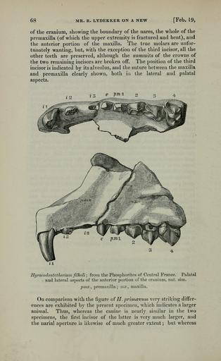 Keywords: PZSL1889Page068.png Hyracodontotherium filholi <small>Lydekker</small> Ephelcomenus filholi <small> Lydekker 1889 </small> en Left upper jaw of an anoplotheriid ungulate from Oligocene phosphorites of Bach near Lalbenque Lot France from ventral above and left lateral below <br/> c canine tooth i1 / i2 / i3 incisors 1-3 3 missing mx maxilla pm1 / 2 / 3 / 4 premolars 1-4 pmx premaxilla Proceedings of the Zoological Society of London http //archive org/details/proceedingsofgen89zool vol 1889 issue 1 http //archive org/stream/proceedingsofgen89zool page/68/mode/1up page 68 1889 R Lydekker text PD-old Mammals of Lot Book pages Extinct Artiodactyla Artiodactyla fossils Cenozoic fossils from France Jaws Lalbenque Oligocene animals Oligocene fossils PZSL 1889-1 Tylopoda |