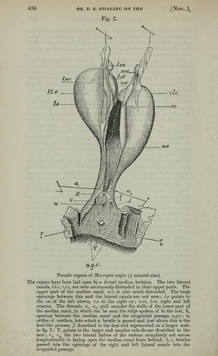 Keywords: PZSL1889Page438.png Macropus major Macropus giganteus <small> Shaw 1790 </small> ™ en Genitals of female Eastern Grey Kangaroo from dorsal <br/> a<sub>1</sub> / a<sub>2</sub> threads to fix median canal b probe through right lateral canal c probe through left lateral canal f keel-like process l l c left lateral canal l o left os uteri l ov left ovary m c median canal opened dorsally r<sub>1</sub> / r<sub>2</sub> halves of dissected rectum r l c right lateral canal r o right os uteri r ov right ovary u probe through urether u g c urogenital passage X opening of median canal into urogenital passage Y blind passages Proceedings of the Zoological Society of London http //archive org/details/proceedingsofgen89zool vol 1889 issue 4 http //archive org/stream/proceedingsofgen89zool page/438/mode/1up page 438 1889 published 1890 E C Stirling text PD-old-70-1923 PZSL 1889-4 Macropus giganteus anatomy Mammal female reproductive system Marsupial reproductive system