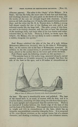 Keywords: PZSL1889Page448.png Rhinoceros bicornis Kilimanjaro Diceros bicornis michaeli <small>Zukowsky 1965</small> ™‚ en Adult male Eastern Black Rhinoceros horns of John C Willoughby specimen from Kilimanjaro with supernumary third horn from left lateral Proceedings of the Zoological Society of London http //archive org/details/proceedingsofgen89zool vol 1889 issue 4 http //archive org/stream/proceedingsofgen89zool page/448/mode/1up page 448 1889 published 1890 Professor Flower text PD-old-70-1923 PZSL 1889-4 Diceros bicornis anatomy Congenital diseases and disorders of animals mammals of Tanzania Nature of Kilimanjaro |