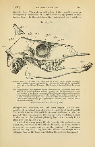 Keywords: PZSL1907Page101.png Giraffa camelopardalis Giraffa camelopardalis <small> Linnaeus 1758 </small> juv en Skull of juvenile giraffe about 1 year old from the Natural History Museum right lateral view can bifoliate canine tooth gt l conical swelling of the parietal bone gt m position of the median frontal bone swelling in adult giraffes occ occipital crest ot l position of parietal bone swelling in the Okapi ot m position of the median frontal bone swelling in the Okapi plv ethmoid vacuity p oss lateral ossicone sfp fronto-parietal suture Proceedings of the Zoological Society of London http //archive org/details/proceedingsofzoo19071446zool vol 1907 issue 1 http //archive org/stream/proceedingsofzoo19071446zool page/101/mode/1up page 101 1907 E Ray Lankester text From Trans Zool Soc vol xvi p 293 PD-old <gallery> File PZSL1907Page102 png Lower image Cranium of same specimen viewed from above File PZSL1907Page104 png Upper image Section through ossicone of same specimen </gallery> PZSL 1907-1 Giraffa camelopardalis skulls Giraffa camelopardalis juvenile Collections of the Natural History Museum London Parietal bones |