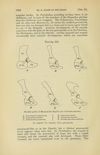 Keywords: PZSL1907Page1054.png A Procolophon trigoniceps Procolophon trigoniceps <small>Owen 1876</small><br/> B Galechirus scholtzi Galechirus scholtzi <small>Broom 1907</small><br/> C Ictidosuchus primævus Ictidosuchus primaevus <small>Broom 1900</small><br/> D Oudenodon baini sic Oudenodon bainii <small>Owen 1860</small><br/> E Galesuchus browni sic Aelurosuchus browni <small>Broom 1906</small><br/> F Ornithorhynchus anatinus <small></small> Ornithorhynchus anatinus <small> Shaw 1799 </small><br/> en Shoulder joint of the Platypus F compared to mammal-like reptiles Sc scapula Co coracoid P Co procoracoid Proceedings of the Zoological Society of London http //archive org/details/proceedingsofzoo19074471121zool vol 1907 issue 4 http //archive org/stream/proceedingsofzoo19074471121zool page/1054/mode/1up page 1054 1907 published 1908 R Broom text PD-old PZSL 1907-4 Shoulders Evolutionary zoology Reptiliomorpha Procolophon Anomodontia Ictidosuchidae Oudenodon Bauriidae Ornithorhynchus anatinus anatomy Scapula Animal bone comparisons |