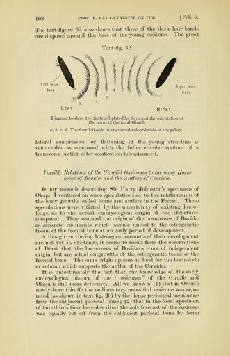 Keywords: PZSL1907Page108.png Giraffa camelopardalis antiquorum ™‚ × G c wardi ™ Giraffa camelopardalis antiquorum <small>Swainson 1835</small> ™‚ × G c giraffa <small>von Schreber 1784</small> ™ foetus en Top of head of hybrid giraffe foetus Kordofan Giraffe male × South African Giraffe female from above Recovered at about 350 days of gestation two-third term from mother which died in London Zoo on May 5 1906 a /b /c /d bands of dark hairs around horn bases Proceedings of the Zoological Society of London http //archive org/details/proceedingsofzoo19071446zool vol 1907 issue 1 http //archive org/stream/proceedingsofzoo19071446zool page/108/mode/1up page 108 1907 E Ray Lankester text PD-old <gallery> File PZSL1907Plate05 png Same specimen head from above File PZSL1907Page106 png Same specimen partially dissected head from right lateral File PZSL1907Page107 png Same specimen left horn File PZSL1907Page112 png Same specimen skull from right lateral File PZSL1907Page115 png Same specimen head from left lateral File PZSL1907Page116 png Same specimen section of skin between horn bases File PZSL1907Page117 png Same specimen section of skin of forehead File PZSL1907Page118 png Same specimen pattern of hairs on forehead </gallery> PZSL 1907-1 1906 Giraffa camelopardalis hybrid foetus from London Zoo |